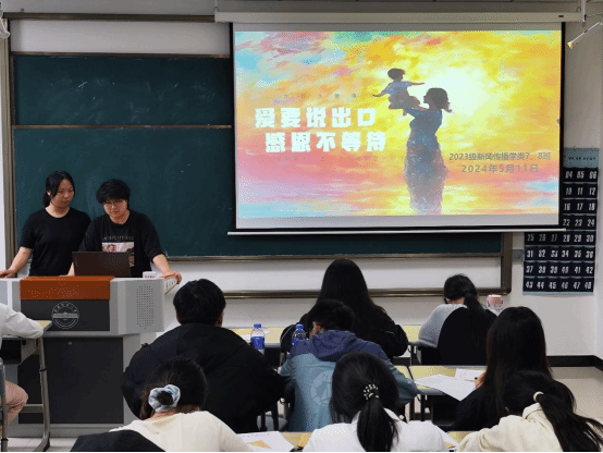 “同學(xué)們,猜一猜明天是什么節(jié)日啊?”“母親節(jié)!”5月11日,新聞傳播學(xué)類專業(yè)2023(7)、(8)班在K202教室開展以“愛要說出口,感恩不等待”為主題的團建活動。活動開始前,活動負(fù)責(zé)人、新聞傳播學(xué)類專業(yè)2023(7)、(8)班的班長楊雨霏、朱研溪提前為每位同學(xué)準(zhǔn)備好信紙和信封。朱研溪說:“我們希望通過寫信這種傳統(tǒng)而深情的溝通方式,讓同學(xué)們勇敢表達(dá)自己的心聲,將對母親的愛訴說于筆尖。”學(xué)生們觀看一段關(guān)于母愛的感人短片后,...